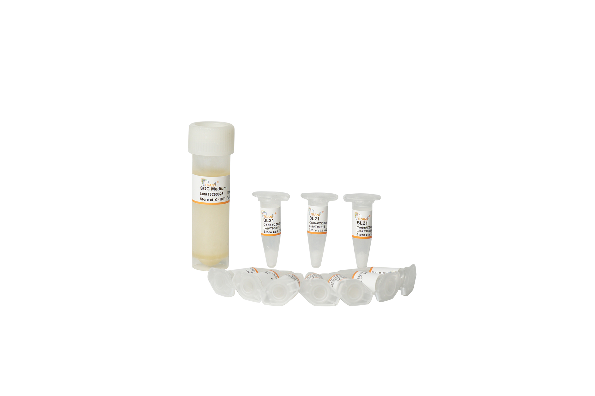 Trans BL21化學(xué)感受態(tài)細(xì)胞采用進(jìn)口菌株,經(jīng)特殊工藝制作,可用于DNA的化學(xué)轉(zhuǎn)化。細(xì)胞具有四環(huán)素(TetR)抗性。使用pUC19質(zhì)粒檢測,轉(zhuǎn)化效率可達(dá)107 cfu/μg DNA。使用Control Plasmid II (Amp+)用于檢測細(xì)胞是否具有表達(dá)功能,表達(dá)蛋白大小為26 kDa。
