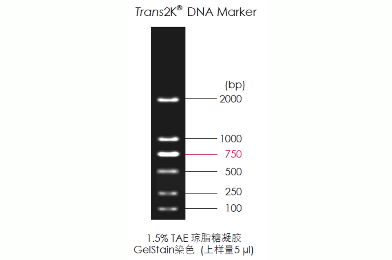 Trans2K? DNA Marker是由6條線狀雙鏈DNA條帶組成,適用于瓊脂糖凝膠電泳中DNA條帶的分析,不建議用于聚丙烯酰胺凝膠電泳。本產(chǎn)品為即用型產(chǎn)品,已含有1×Loading Buffer,可根據(jù)實驗需要,直接取5 μl電泳,使用方便, 電泳圖像清晰。其中750 bp條帶濃度為100 ng/5 μl,顯示亮帶,其余條帶濃度均為50 ng/5 μl。便于準(zhǔn)確判斷目的產(chǎn)物DNA的量。