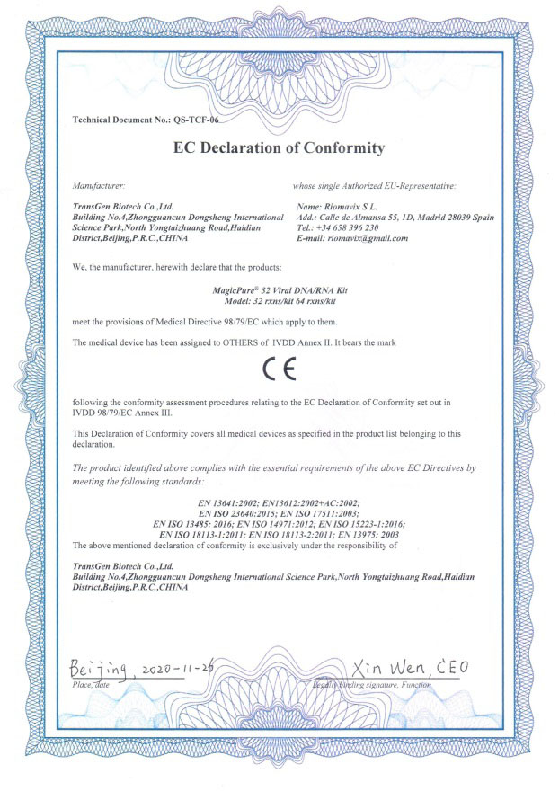 今日,全式金自主研發(fā)生產(chǎn)的磁珠法病毒核酸提取試劑盒(32通道)(MagicPure? 32 Viral DNA/RNA Kit),完成歐盟CE認(rèn)證,標(biāo)志著我司產(chǎn)品符合歐盟相關(guān)指令的要求,已完成歐盟主管當(dāng)局登記注冊(cè),具備歐盟市場(chǎng)的準(zhǔn)入條件。近日,我司多個(gè)病毒檢測(cè)產(chǎn)品接連獲得歐盟CE認(rèn)證,這是對(duì)我司產(chǎn)品的認(rèn)可,對(duì)全式金人的鼓勵(lì)。