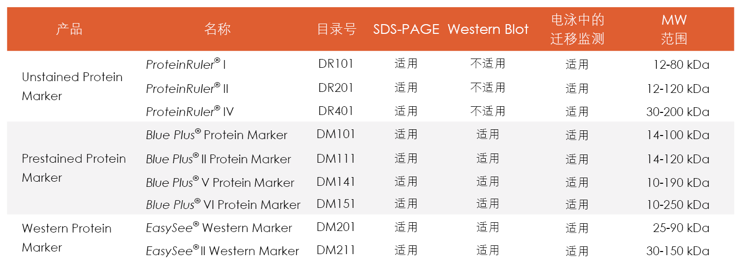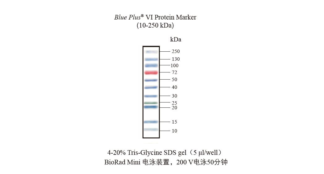 本產品由11種預染蛋白質組成,分子量范圍為10 kDa-250 kDa。其中72 kDa為橙色條帶,10 kDa、15 kDa、20 kDa、30 kDa、 40 kDa、50 kDa、100 kDa、130 kDa、250 kDa為藍色條帶,25 kDa為綠色條帶,可以動態(tài)觀察蛋白質電泳狀態(tài)及清晰地判斷蛋白轉膜效果。經SDS-PAGE電泳后轉移到PVDF或NC膜上可見清晰的彩色條帶。橙色條帶和綠色條帶可以方便地判斷轉膜的方向。