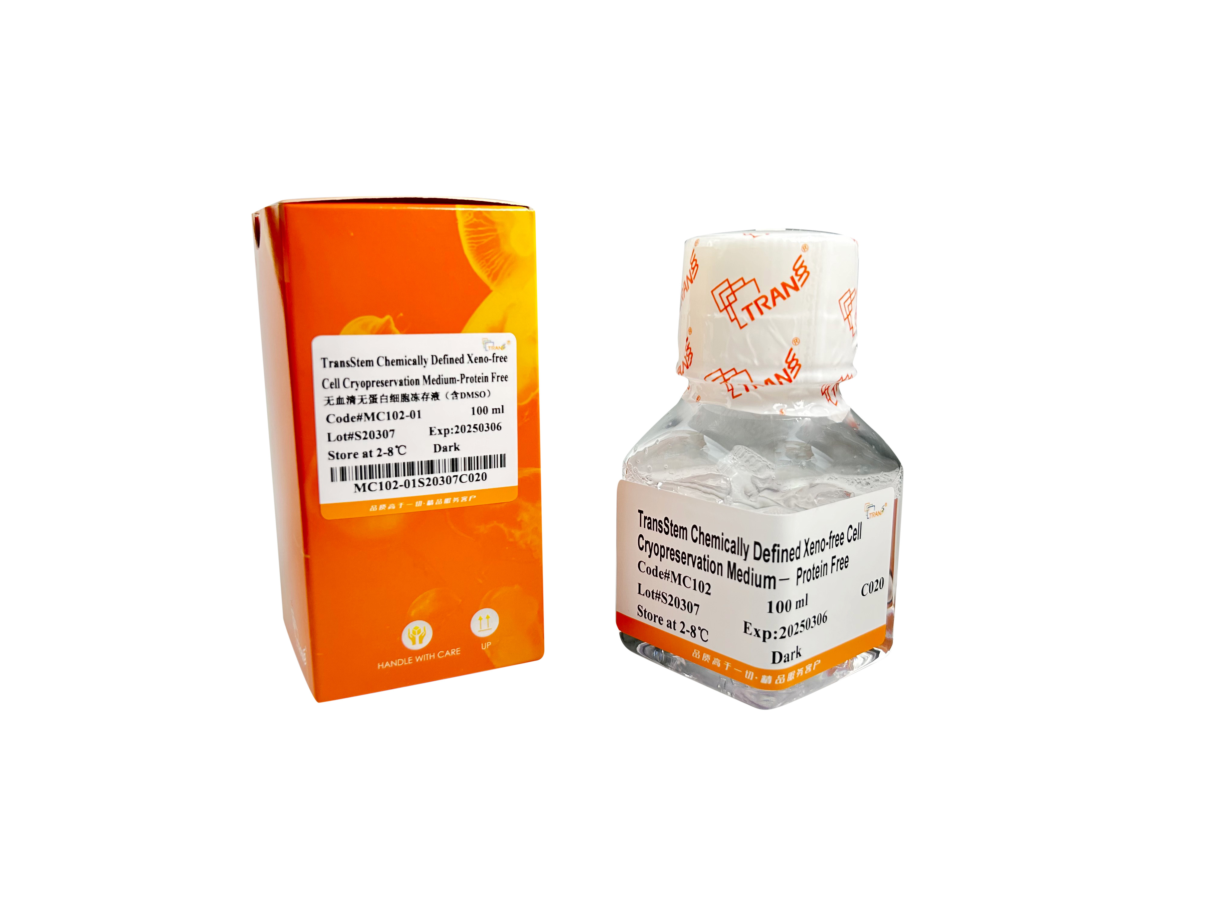 TransStem? Chemically Defined Xeno-free Cell Cryopreservation Medium—Protein  Free 是一種化學(xué)成分明確、無動物源性成分、不含蛋白的即用型細胞凍存液,含10% 二甲基亞砜(DMSO),可用于凍存各種細胞類型,包括間充質(zhì)干細胞,淋巴細胞等。該產(chǎn)品穩(wěn)定性好,能有效提高各類細胞凍存后的復(fù)蘇活率。使用該產(chǎn)品凍存細胞可直接存放于-80℃冰箱凍存,無需經(jīng)過費時的程序降溫過程。