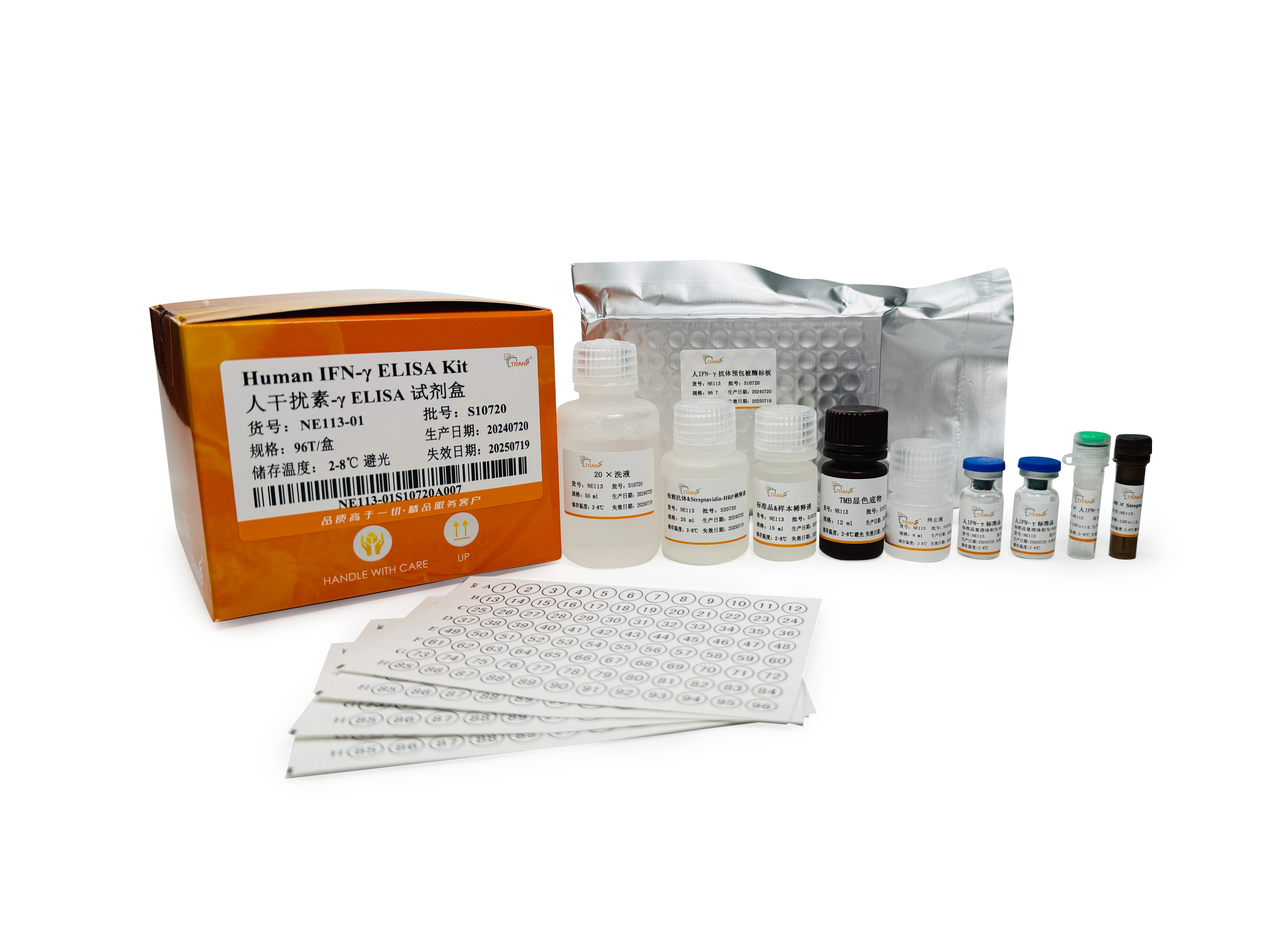 本試劑盒采用雙抗體夾心ELISA法定量測定人血清、血漿和細胞培養(yǎng)上清中的IFN-γ含量。本試劑盒采用高親和力的抗人IFN-γ抗體預(yù)包被酶標板,將標準品/待測樣本和生物素標記的抗人IFN-γ檢測抗體同步加入微板孔中,經(jīng)過孵育后樣本中存在的IFN-γ會與酶標板上的預(yù)包被抗體和檢測抗體特異性結(jié)合。洗滌去除未結(jié)合物后,將辣根過氧化物酶標記的鏈霉親和素(Streptavidin-HRP)加至微孔板中并孵育,通過檢測抗體上的生物素和鏈霉親和素發(fā)生的高強度非共價結(jié)合,形成“包被抗體-人IFN-γ蛋白-檢測抗體-Streptavidin-HRP”免疫復(fù)合物。再次洗滌后,將顯色底物TMB加至微板孔中,HRP會催化TMB底物生成藍色產(chǎn)物,顏色反應(yīng)的深淺將與樣本中IFN-γ的濃度成正相關(guān)。而后加入終止液終止反應(yīng),在450 nm波長(參考波長570 - 630 nm)處測定吸光度值。通過繪制標準曲線,由樣本吸光度值可計算出樣本中所含IFN-γ濃度。本試劑盒特異性強、檢測靈敏度高,同時操作更加便捷。