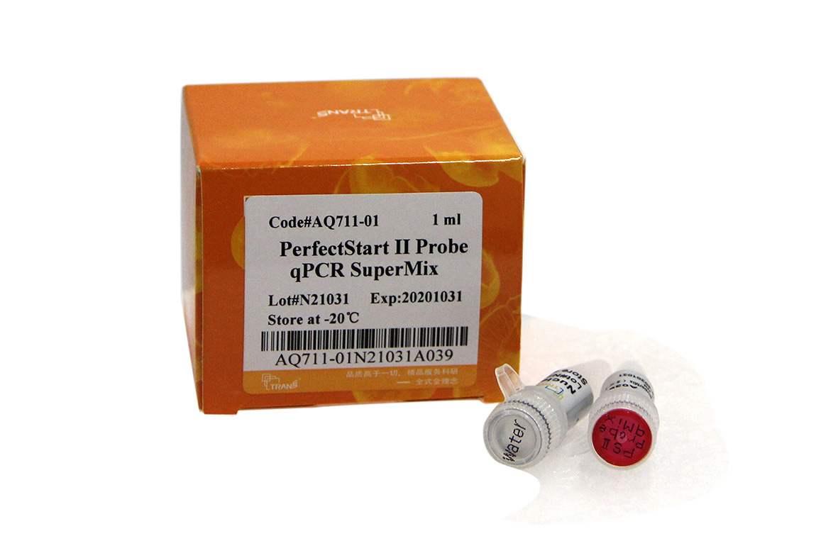 PerfectStart? II Probe qPCR SuperMix利用在PCR體系中加入熒光探針 (TaqMan或Molecular Beacon等),擴增過程中其 熒光量與擴增產物量成正比,通過熒光量的檢測測定樣本核酸量。本產品含PerfectStartTM Taq熱啟動酶 (利用3種單克 隆抗體與Taq DNA Polymerase高效結合,有效地封閉了DNA聚合酶活性,阻止了低溫下的非特異性擴增)、特殊優(yōu)化的qPCR反應緩沖液、dNTPs、PCR增強劑、穩(wěn)定劑。本產品濃度為2×,使用時只需加入模板、引物、探針、Passive Reference Dye (根據qPCR儀選擇) 和水,使其工作濃度為1×,即可進行反應。