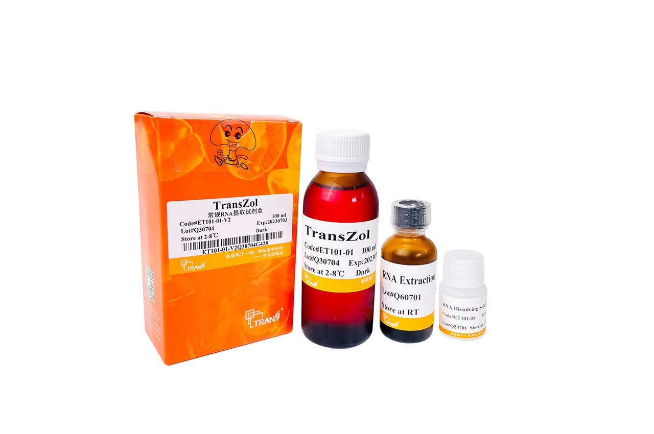 TransZol利用異硫氰酸胍裂解細(xì)胞。在樣品的裂解過程中,TransZol可保持RNA完整性,加入RNA Extraction Agent后,溶液分為無色水相和粉紅色有機(jī)相,RNA在水相,用異丙醇可沉淀回收RNA,有機(jī)相用異丙醇可回收蛋白質(zhì)。適用于快速提取多種組織和細(xì)胞中的總RNA。