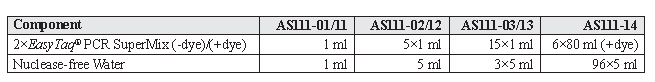 EasyTaq? PCR SuperMix (-dye)包含EasyTaq? DNA Polymerase、dNTPs和優(yōu)化的反應(yīng)緩沖液,濃度為2×。DNA擴(kuò)增時(shí),只需加入模板、引物和水,使SuperMix溶液的濃度為1×即可進(jìn)行反應(yīng)。擴(kuò)增產(chǎn)物3' 端帶“A”堿基,2×EasyTaq? PCR SuperMix (-dye) 擴(kuò)增產(chǎn)物可直接克隆于pEASY?-T系列載體中;2×EasyTaq? PCR SuperMix (+dye) 擴(kuò)增產(chǎn)物可直接點(diǎn)樣電泳,如用于克隆,需純化去掉染料。其PCR產(chǎn)物不適用于聚丙烯酰胺凝膠電泳。